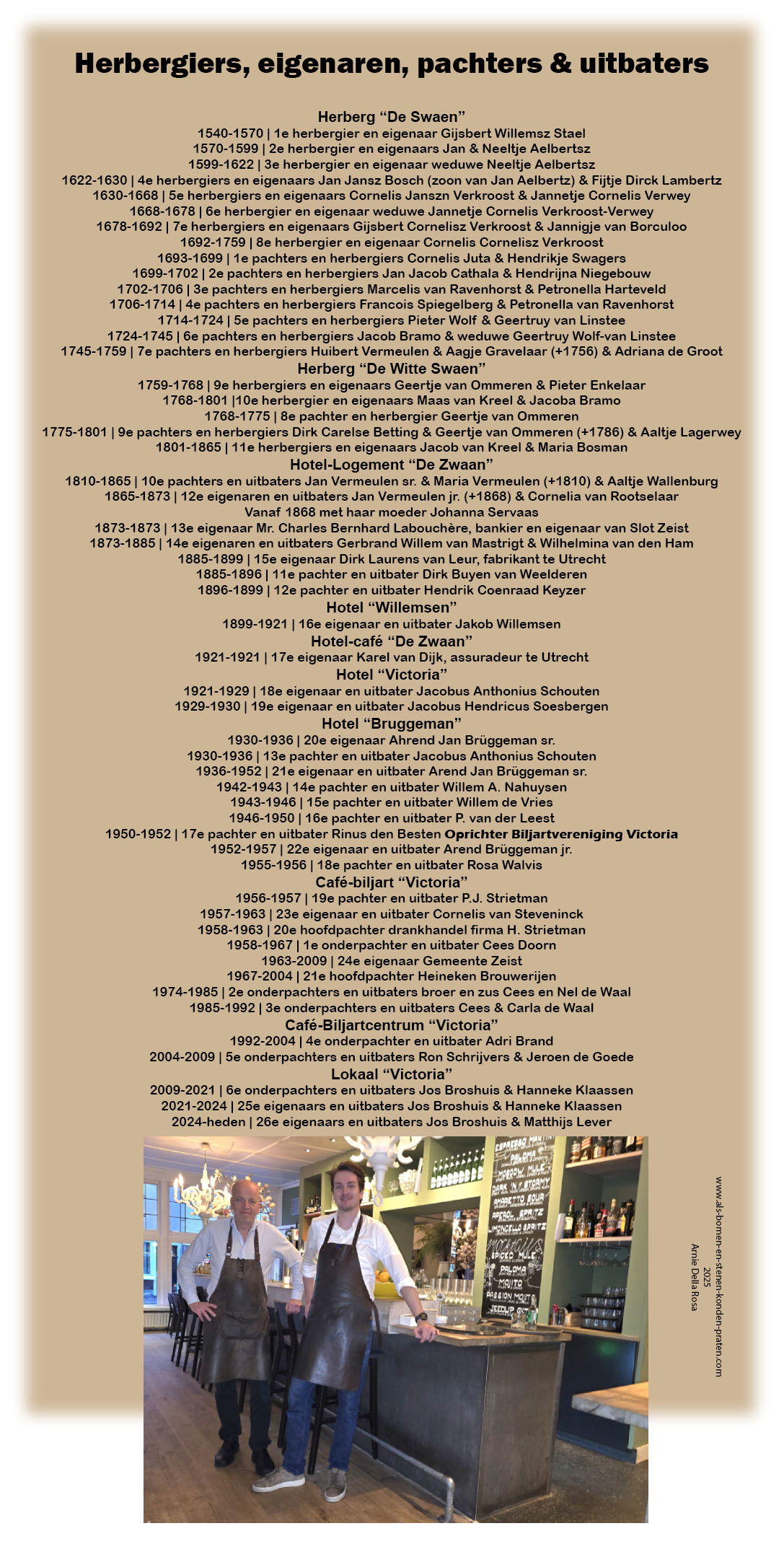 Lokaal Victoria is de oudste horecagelegenheid van Zeist en zoals alles door de eeuwen heen verandert, veranderde ook talloze keren de naam, functies, eigenaars en huurders van dit etablissement. Ook werd de naam van dit etablissement door de jaren heen niet consequent hetzelfde gevoerd. De ene keer was het “De Swaen” en dan weer “De Witte Swaen” in 1759, “De Zwaan” in 1816 afgewisseld met “De Witte Zwaan” en toch weer “De Swaen”. Vanaf 1900 werd er niet meer over logement maar over hotel gesproken. Eerst nog “Hotel De Swaen,” in 1900 “Hotel Willemsen”, 1910 “Hotel De Zwaan”, 1920 “Hotel Victoria”, 1923 “Hotel de Zwaan”, 1930 “Hotel Bruggeman”, in 1955 weer “Hotel Victoria”, in 1998 “Café Biljartcentrum Victoria” en sinds 2009 “Lokaal Victoria”. Het dwars door elkaar gebruik van herberg, logement, café, restaurant, hotel, pension, biljartcentrum en nu lokaal was bij het onderzoek en schrijven van dit verhaal erg verwarrend. Zo werd ook de herbergier logementhouder, cafébaas, restauranthouder, hotelier, uitbater en eigenaar, huurder of onderhuurder genoemd. Het enige en allerbelangrijkste dat in al deze jaren niet veranderde, was dat dit etablissement tot op de dag van vandaag een gezellige ontmoetingsplaats of huiskamer bleef, waar dorpsgenoten elkaar ontmoetten en waar je iets kon eten en of drinken. Victoria heeft roerige tijden gekend met vele gebeurtenissen, verbouwingen, sloop en nieuwbouw in 1896, veranderende functies, maar het staat nog stevig boven op de nog steeds in gebruik zijnde middeleeuwse kelder met dito plavuizen vloer. Als je Lokaal Victoria bezoekt en je in de achterste zaal aan de 1e Dorpsstraat goed kijkt, zie je links naast de oorspronkelijke ingang het luik liggen dat naar deze kelder leidt en waarboven de gelagkamer van de voormalige herberg lag. Het etablissement kende de afgelopen vijf eeuwen 25 eigenaars, 22 huurders en 5 onderhuurders (zie het hoofdstuk “Eigenaren, huurders en onderhuurders”). Opgemerkt dient te worden dat er een gat zit met onbekende huurders in de jaren 1974 tot 1998. Weet jij de namen van deze onderhuurders, laat het mij dan alsjeblieft weten.