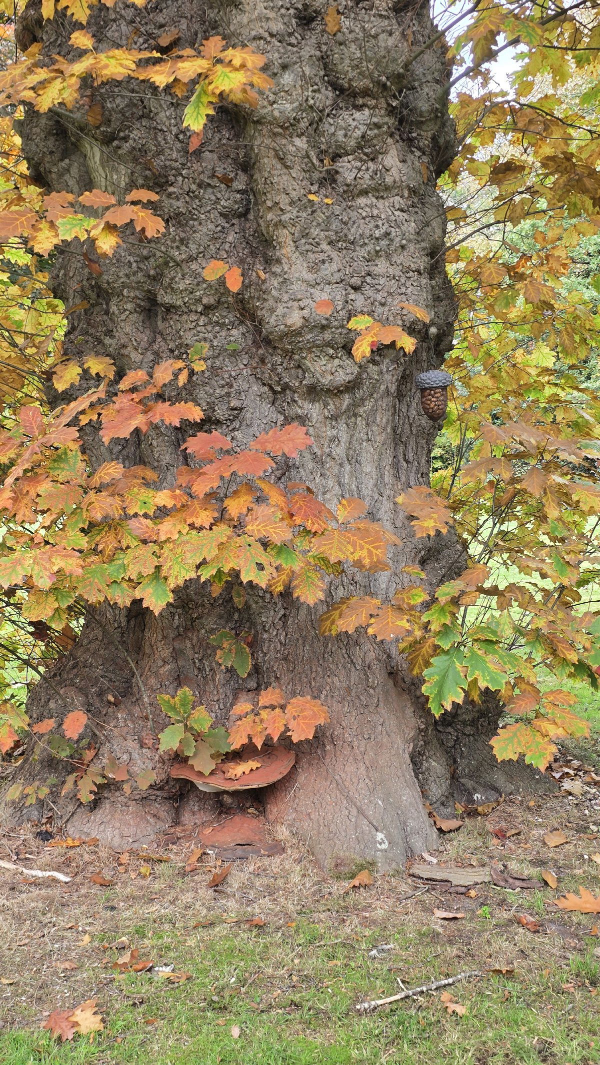 We moeten gaan want de bijzondere eikel kan ik hier niet vinden en op weg naar huis wil ik op “Buitenplaats Pavia” die enorme Amerikaanse eik zien. Deze majestueuze ruim 165 jaar oude reus met bolle eikels staat achter in de tuin vlak bij het water, heeft een bultige stamomtrek van ruim 4,22 meter en een hoogte van ruim 20 meter. Dichter bij de boom aangekomen zie halverwege de stam rechts een enorme eikel hangen. Meteen schiet mij het beledigend bedoelde gezegde te binnen “je hoeft niet aan een boom te hangen om een eikel te zijn”. In de op dit moment onstabiele wereld, moet ik denken aan de veroorzaker daarvan, de Amerikaanse president Donald Trump. Wat heeft deze man in korte tijd een ellende in de wereld veroorzaakt. Dit móet dus wel de “Trump Eikel” zijn, want deze eikel lijkt op de met zichzelf ingenomen, opgeblazen, bolle en oranje geschminkte heerschap met al zijn vervelende en irritante maniertjes. Zijn manier van spreken met het hoofd ietwat schuin, dat mondje en vingertje, het handen schudden, het wegzetten van hem afhankelijken, zoals President Zelensky, maar ook van Democraten, tegenstanders of andersdenkenden. Ze uit hun functie zettend omdat ze het niet eens zijn met zijn beleid. Het iedere keer terugkomen op toezeggingen en beloftes, zijn zwalkend beleid. Bouwend aan zijn eigen heiligdom of koninkrijk en de wereld in een chaos achterlatend. Willen slapen in paleizen bij koningen en koninginnen. Hij voelt zich als een vorst maar gedraagt zich als een verwend kind. Door dit alles gaan mijn nekharen al overeind staan bij het horen en zeker bij het zien van deze man. Ja, het gezegde “je hoeft niet aan een boom te hangen om een eikel te zijn” is zeer toepasselijk op hem. Maar ook deze oude reus is aan het einde van zijn loopbaan, getuige de “Dikrandtonderzwam” die onderaan de stam is begonnen de poten onder zijn dikke lijf op te vreten. Is dit toeval?